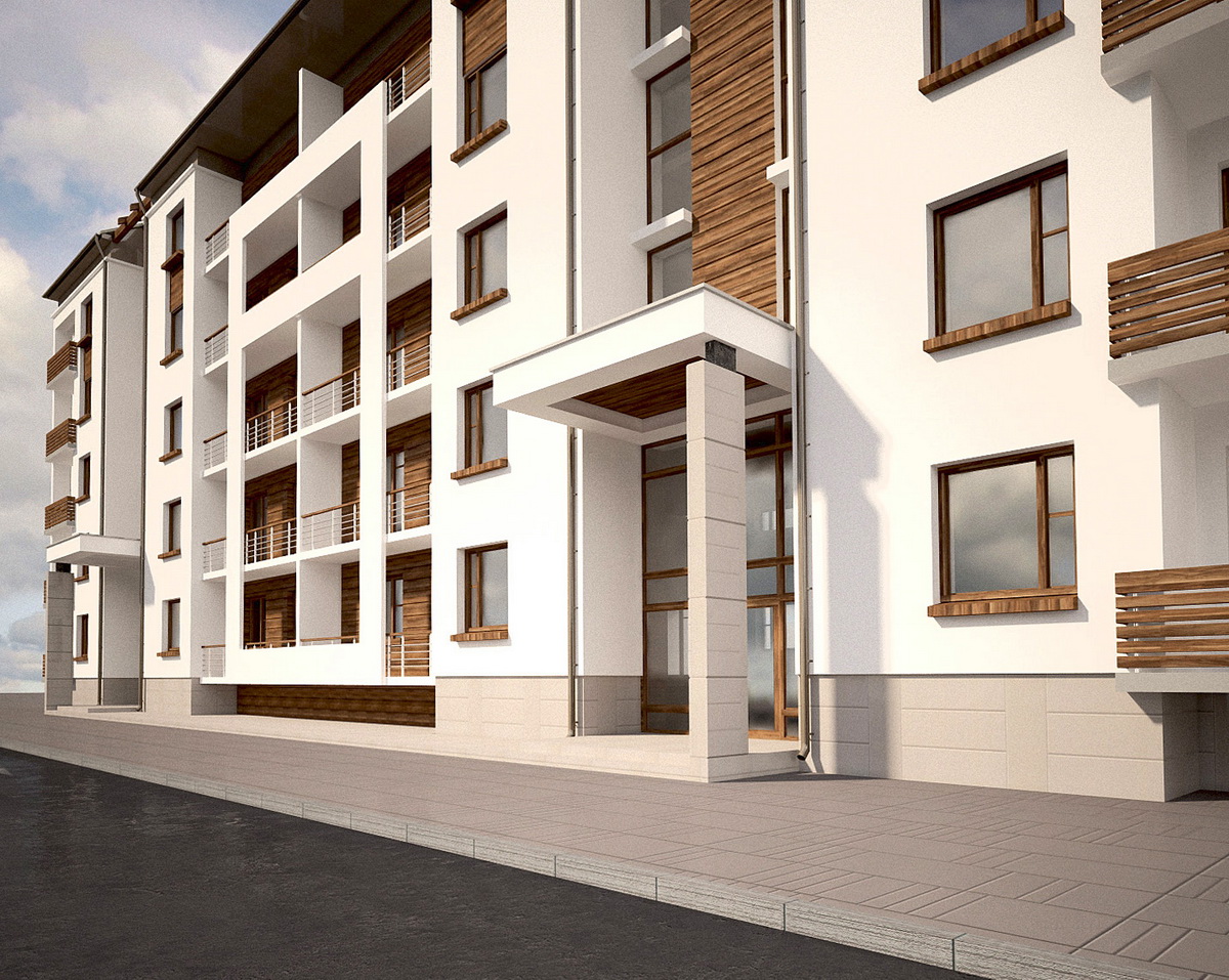 Один з варіантів оздоблення фасадної частини будівлі в якому передбачене декоративне оздоблення імітуючи деревину окремих частин будівлі.